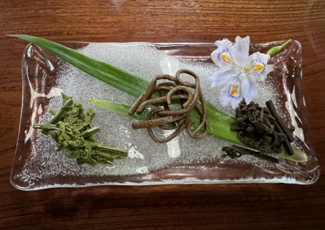 お昼は、床瀬そばで有名な床瀬の集落にある『 山椒庵 』さんへ。おそば以外に、いろいろなものを炭火で自分で焼いて食べるスタイルのお店です。店主の方がいろいろとお話ししてくださって、満席でしたので写真は撮れませんでしたが、最初に出てきた山菜にシャガが飾ってあったので8naの日用にパチリ。お店の入口や山の斜面に群生していました。