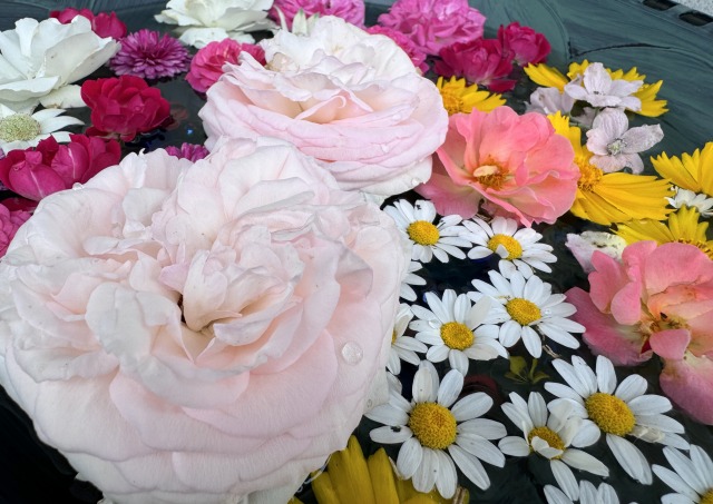このピエールちゃん、前回も書きましたが、咲いてはくれたもののなかなか上向きにならず、下を向くなら浮かんでいただき楽しんでいます。