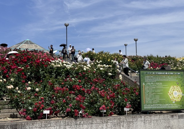 緑町公園には、「ローズヒル」と呼ばれる六角錐状でピラミッド型の花壇があり、ここには市民がバラのオーナーになり、なんとバラに好きな名前をつけていいそうです。市民一体の取り組み、『 ばらのまち福山 』ならではですね。
