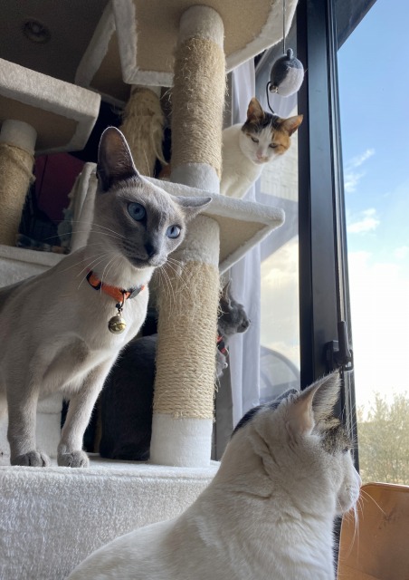 愛猫を迎い入れて3ヶ月、このときは4匹でうまくいっていたのですが、ロシアンブルーの繊細な神経質な性格が、ちょっと気性が荒いシャム猫とは相性が悪いのかな?外では、反対に愛猫が新猫を追いかけたりと、遊んでいるようにも見えますし、愛猫のマジ切れは本当に怖い (^^ゞ どうなりますやら。