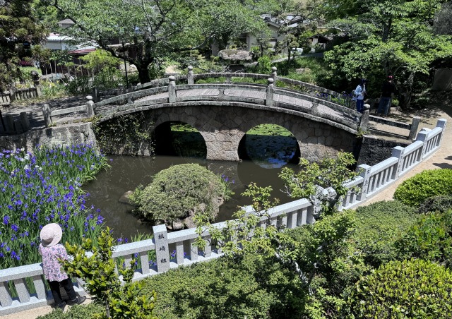 境内の御手洗池にかかる石の眼鏡橋は、明治20年に完成されたもので、県の重要文化財に指定されています。