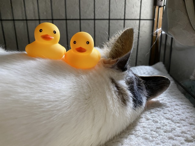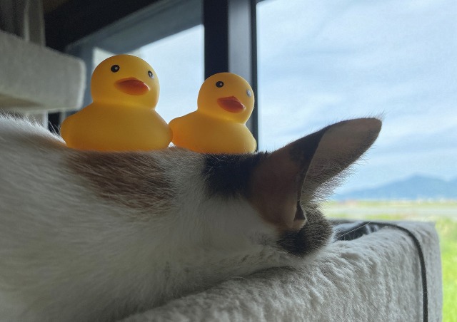 2年前の新猫、大人しくラバーダックを頭に乗せて(笑)最近乗せたことがないけど、今でも乗せてくれるかな?