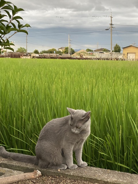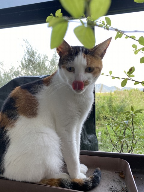 時間は17時46分、まだまだ暑い時間です。しかも、黒のコンポストの上。コンポストの中身は草が中心で、そんなに臭いはしませんが、新猫はコンポストの上が、臭いも含めて?好きなんです(笑)