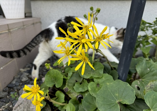 ポスト周りにはツワブキを植えてあるのですが、先日、半田山植物園できれいに開花しているのを見て、はて?うちのはどうした?と思って、モリモリのオシロイバナをかき分けたら開花していました (^^ゞ後ろを通る末猫ぐらい大きかったらわかるのですが(笑)