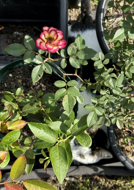ミニバラもポツポツとですが開花中。あら、ここにも末猫。狭いところなのですが、自分の体格がわかっていないのですね(笑)