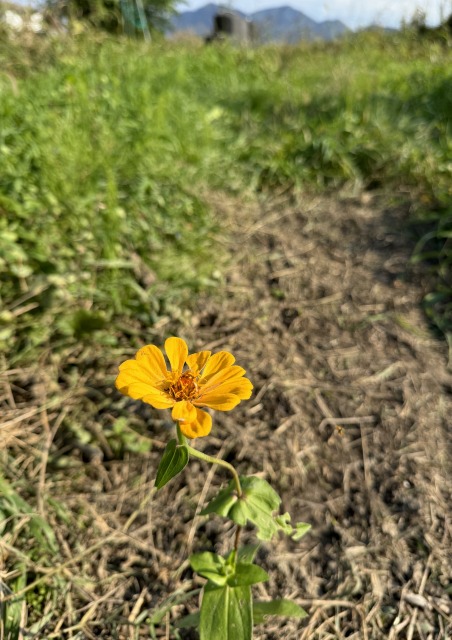 このこぼれ種からのジニアちゃんも、自分がどこに芽を出したのかわかっていないご様子。ここは畑の通路なんです。うちは不耕起栽培ですし、一輪車を使いますので踏まないように奥に行くことができますが、一度や二度は踏んでいたと思います。