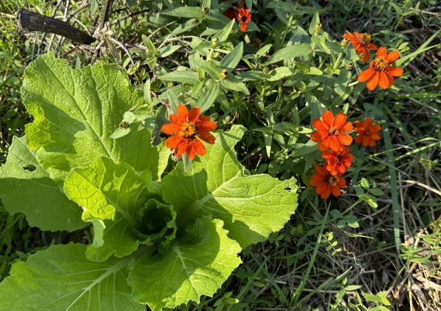 こちらの赤いジニアは畝に植え、夏を越したもの。ジニアは本当にすごい!ハクサイはあとから植えたものですが、う~ん、どちらが先にフニッシュなるか。