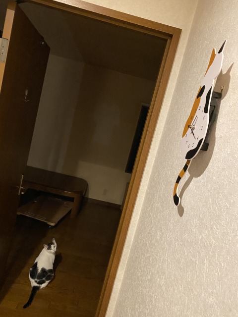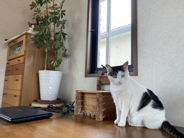 ちょっとびっくりしたというか、涙が出ちゃう行動をとったのは妹猫。部屋の中には、一番に亡き犬・猫んずの写真類を飾ったのですが、すぐに妹猫がやってきました。猫は高いところが好きですから、ここしかなかったのかもしれませんが、大好きだった姫猫、お世話になった叔母猫を拝みにきたみたいです。