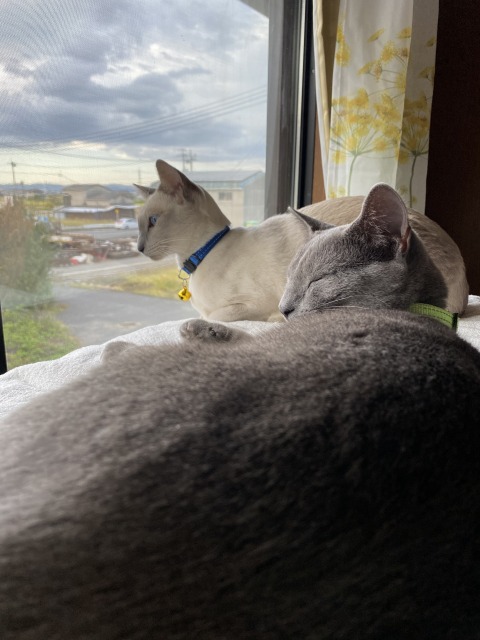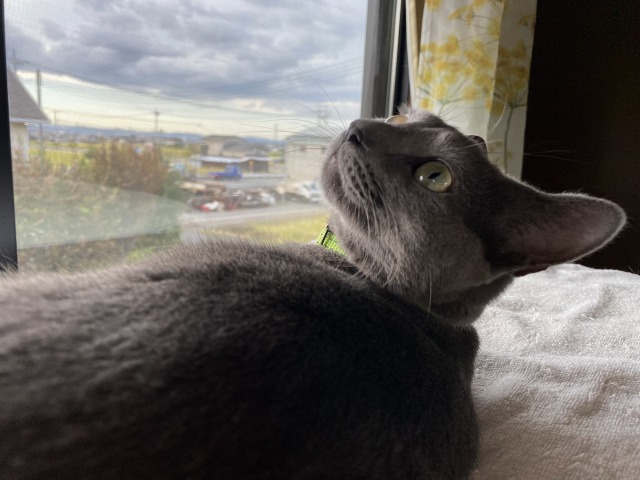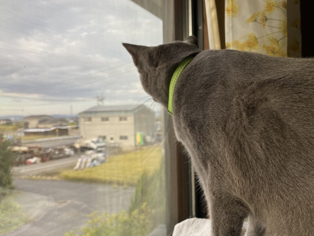 この部屋からは裏の車の通りが見れて、この日は隣地の稲刈りの日、コンバインの動きを追っている愛猫です。