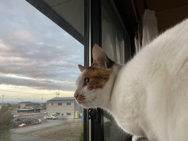 この日の妹猫が何を真剣に見ていたのか、これまたわかりませんが、目がキラッとした妹猫の顔が好きです。