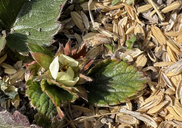 イチゴが開花寸前でした。このあと摘み取って体力温存!5月に備えてもらいます ♫