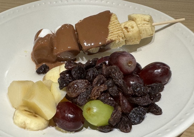 本物のチョコレートファウンテンはこんな感じ。皆さんフルーツ取りに集中して顔が下を向いているので、パチリとさせていただきました。