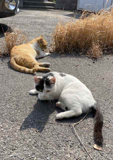 茶トラのご近所猫とは慣れているようです。でも、相手にはされません(笑)もしかして親子関係?黒猫が狙っていますが、ご近所猫では勝てないようです。
